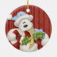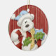 Um urso polar com uma grande bengala vermelha e branca em um fundo vermelho listrado guardando ornamento de férias.