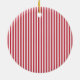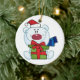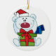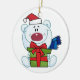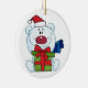 Um adorável urso polar sorridente com um boné de estocagem vermelha guarda um presente de feriado e um fundo vermelho e branco enfeite a parte de trás deste ornamento colorido de festas!
