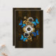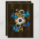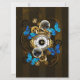 Composição do relógio de aço redondo com discagem numérica romana preta, decorado com engrenagens de ouro e latão, borboletas morfo azuis e lentes danificadas sobre fundo listrado castanho. Estilo Steampunk.