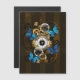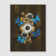 Composição do relógio de aço redondo com discagem numérica romana preta, decorado com engrenagens de ouro e latão, borboletas morfo azuis e lentes danificadas sobre fundo listrado castanho. Estilo Steampunk.