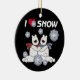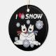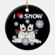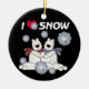 Dois ursos polares se envolvem em um abraço de urso enquanto os flocos de neve caem e o texto lê "I Love Snow" nos ornamentos de feriados que você pode mudar a forma antes de pedir!