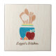 Adicione um toque do hominess a sua cozinha com este azulejo bonito do estilo country que caracteriza um grupo tirado mão do estilo de colheres e de utensílios de madeira da cozinha em um pote de turquesa cercado por uma maçã vermelha deliciosa e por uma fruta fresca. Este design temático da cozinha do país em um fundo de madeira claro do teste padrão pode ser personalizado adicionando seu nome.