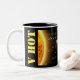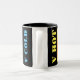 Esta caneca mostra fatos e figuras de Sun e de todos os planetas e de planetas do anão do sistema solar. The Sun é de "espaço QUENTE" e profundo brilhantemente marcado de "FRIO V V". Os planetas são tirados à escala com informações adicionais tal como o tamanho, a massa e o período orbital. Igualmente tem a para escalar o gráfico que mostra as distâncias orbitais de cada objeto. Gráfico do fundo de NASA/JPL.