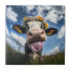 Uma imagem lúdica e aproximada de uma vaca em um prado ensolarado, adornada com uma coroa floral vibrante feita de margaridas e flores silvestres. A vaca põe a língua para fora, acrescentando um toque de humor e charme à cena. O céu azul brilhante e as nuvens suaves no fundo aumentam ainda mais a alegria e caprichosa sensação da imagem.