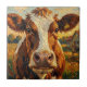 Um azulejo cerâmico de animais fofos da fazenda com uma vaca em estilo impasto fofo em pé em uma fazenda. Close do rosto dele e um fundo de fazenda.
