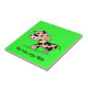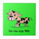 Uma vaca de desenho animado com pequenos chifres fofos e coberta de uma manta de retalhos de manchas irregulares pretas. Está num fundo verde brilhante e a vaca é uma mistura Frísia/Holstein. Código de imagem: Moocou1