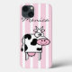 Um design giro giro com uma vaca sorridente contra um fundo listrado em rosa e branco. Pronto para personalizar com seu nome ou monograma.