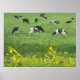Vacas De Laticínios Holstein. Prado verde e flores amarelas silvestres poster foto de vacas negras/ brancas pastoreando em um campo rural com varas de madeira e cerca e flores amarelas fora de foco em frente à foto em um bom primavera no impressão de maio de fazenda. Este poster de vacas é totalmente personalizável, adicione seus textos e imagens! Bonitos presentes de vaca para os habitantes das vacas e para os fãs do exterior e da natureza rural!