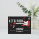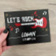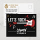Vamos Convocar o Rock! Este convite de cartão postal impresso frente e verso é perfeito para uma festa de aniversário com tema de música rock and roll. A frente do cartão postal apresenta elementos pretos, dourados e vermelhos, incluindo uma guitarra elétrica, estrelas, notas musicais e raios. Personalize o verso do cartão postal com os detalhes da sua festa para o convite perfeito e envio fácil.