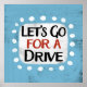 "Vamos Go For A Drive" é um design de texto bonito, em azul claro, com texto preto e vermelho, juntamente com uma forma de sotaque branca e pontos brancos texturizados ao seu redor.