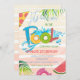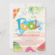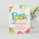 Convite de Verão para Festa de aniversário de Piscina com areia, salpicos, melancia e folhas tropicais.