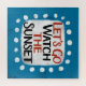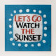 "Vamos Go Watch The Sunset" é um design de texto bonito, em azul claro, com texto preto e vermelho, junto com uma forma de sotaque branco e pontos brancos texturizados ao seu redor.