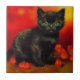 Azulejo com um gatinho preto no estilo de Vincent van Gogh! Este gatinho fofo se posou com flores vermelhas. O presente perfeito para amantes de gatos e colecionadores de arte holandeses!