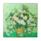 Tile featuring Vincent van Gogh’s oil painting Vase with Pink Roses (1890). A gorgeous bouquet of roses are in a vase against a green background. A perfect gift for fans of Post-Impressionism and Dutch art.