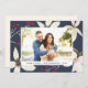 Mande cartões de natal para amigos e família em estilo chic com nossos cartões com fotos elegantes. Sua foto está bordada em branco, sobre um fundo azul marinho enfeitado com flores de baunilha cremosas e bagas vermelhas. Personalize com sua saudação personalizada (mostrada com "desejos calorosos") e seu nome de família ou nomes individuais.