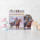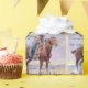 O vaqueiro no cavalo que sustenta uma bebida como um brinde com texto que lê aqui é-lhe…. Em seu aniversário