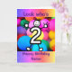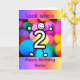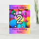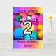 Um desenho bonito de um número dois com um rosto sorridente e mãos e pés. O cartão tem um fundo colorido de efeito de brilho e balões. A mensagem diz "Olha quem tem 2 anos". Envie este cartão para a criança de dois anos na sua vida para celebrar o seu segundo aniversário! Personalize facilmente esta placa editando o texto modelo na frente e no dentro.