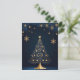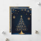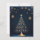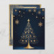 Este cartão de Natal, maravilhosamente desenhado, apresenta uma elegante árvore de Natal decorada com ornamentos e luzes de ouro, revestida com uma estrela brilhante ouro. A árvore é destacada contra um fundo escuro com padrões sutis de folha e estrelas pequenas ouros penduradas ao seu redor. No final, "Feliz Natal" é escrito em um roteiro elegante de ouro. A frente do cartão capta o espírito festivo com sua intrincada e festiva design. No verso, a placa apresenta uma página de vazio ao estilo vintage com padrões decorativos, oferecendo amplo espaço para escrevendo uma mensagem pessoal e sincera. Perfeito por enviar desejos de férias calorosos para os entes queridos.