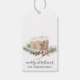 Uma marca de presente de Natal russa, cor-de-água, de cor-d'água, com velas, e pinheiros. Uma etiqueta de presente de feriado bonito e neutra.