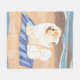Um doce design para decoração e visto no verão. Pequeno corcunda está ficando bronzeado na praia com uma expressão felicidade em seu rosto.