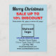 Feliz Natal! Um dos feriados mais comemorados do ano. É também uma das melhores estações para anunciar sua empresa ou promover seu nome de marca para clientes ou clientes. Folheto personalizável com venda de Natal, seu nome comercial e outras informações de sua empresa, um material de marketing que você pode usar para atrair mais clientes. Personalize-o e distribua-o para atrair mais clientes para comprar seus produtos ou clientes para gostar de seus serviços. As cores design são textos em preto, azul escuro e vermelho sobre fundo azul claro. Para personalizar este folheto, especifique o desconto percentual que você oferecerá e as datas de venda. Carregue também o logotipo da sua empresa, digite seu nome, endereço, número de telefone, e-mail e site ou a página de mídia social da sua empresa. Verifique a aparência nos lados frontal e traseiro após digitar textos e carregar logotipo. Se a aparência lhe agrada, você pode colocar seu pedido agora. Se você precisar redimensionar e mover os textos e o logotipo para o ajustado neste folheto ou no tamanho que você escolher, mude na ferramenta design. Você também pode alterar a cor do plano de fundo, a cor da fonte e o estilo da fonte na ferramenta design. Feliz Natal! Desejando mais vendas neste feriado.