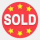 Os autocolantes redondos vendidos com texto branco "Vendidos" num fundo vermelho com estrelas amarelas.