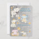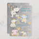 Uma aquarela pintou o convite de festas infantil com elefantes dançando e balançando em seu mini circo elefante com estrelas de ouro e uma corda apertada sobre fundo sombrio de cinza.