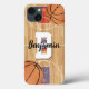 Esta capa de telefone personalizada tem um design de fãs de basquete com uma quadra de basquete e duas bolas de basquete ilustradas. Personalizou esta capa de telefone com um primeiro ou sobrenome e um inicial. Um presente esportivo personalizado para dar ao fã de basquete na sua vida que joga cartas.
