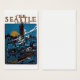 Um poster vintage de promoção de viagem para Seattle, Washington, durante o ano de 1915. Uma bela vista do porto e arquitetura de Seattle, como vista à noite com uma ascensão de lua de cheio no fundo.