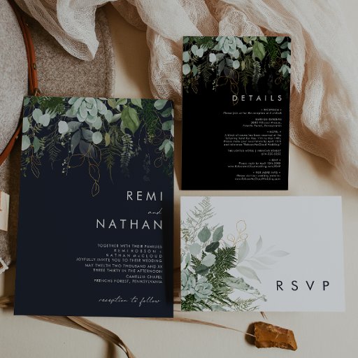 Nós projetamos este verde e folha de ouro | marinho escuro para completar seu simples e elegante casamento de boho. Apresenta folha de eucalipto verde e branca moderna, folhagem de fêmur, flor suculenta e folhas de folha de ouro mínimas. Esses elementos dão a sensação de uma floresta encantada de aquarela branca, perfeita para qualquer casamento rústico e boêmico! Sinta-se à vontade para personalizar e torná-lo seu; também, sinta-se à vontade para procurar o resto da coleção por produtos de correspondência e coordenação!