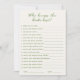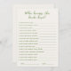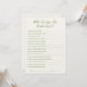 Um cartão de jogo "Quem conhece melhor a noiva?", com fonte verde escrita à mão e texto totalmente personalizável. O cartão de jogo baixável vem num esquema de cores neutras de verde e náusea.
