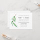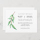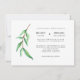 Este convite de casamento ultra na moda apresenta uma aquarela que parece folhas verdes em um caule, com texto preto sobressalente em um fundo branco limpo.