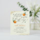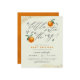 Está a caminho um pouco de gracinha! Celebrar a futura mãe com esta design com aquela frase em letras elegantes, com laranjas pintadas à mão e folhas verdes sobre um fundo verde pastel. Os detalhes do seu chá aparecem abaixo na tipografia moderna. Há brilho dourado nos cantos superior esquerdo e inferior direito.