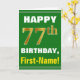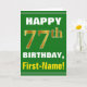 Este simples design de cartão de saudação com tema de aniversário apresenta um desejo de aniversário quente como "FELIZ 77º ANIVERSÁRIO, Primeiro Nome!" na frente, em texto em negrito sobre um fundo de cor verde. O número de aniversário tem uma aparência falsa e imitada de cor dourada. O nome na frente pode ser personalizado. O dentro apresenta uma mensagem de aniversário que pode ser personalizada. Um cartão de saudação como este poderia ser uma maneira divertida de fazer votos de aniversário a alguém que comemora seus setenta e sete anos. [~Z0000279]