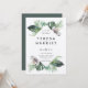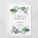 Convite rústico tropical verde, com palmas, florais tropicais em um sutil design de aquarela. Casamento de verão, casamento rústico ou até mesmo um casamento de jardim com um tema tropical.