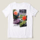 O design nesta camiseta é um grupo de fotografias originais de flores laranja, flores lavandas e folhas tropicais. As cores vão de pastéis macios a brilhantes, com uma variedade de verdes em sombra e luz brilhante. Na camiseta diz "VIVENDO VERDE com laranja e lavanda" em um canto da design.