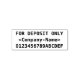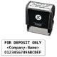 Este simples design de carimbo apresenta a mensagem "SOMENTE PARA DEPÓSITO", juntamente com um nome pessoal/comercial personalizado e um número de conta. Pode ser utilizado por um trabalhador administrativo, um funcionário de escritório ou um indivíduo para acrescentar de forma eficaz um endosso restritivo a um cheque.