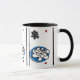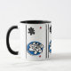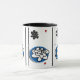 A caneca de café amigável da flor caracteriza flores com acentos geométricos contemporâneos em vermelho, em preto, e o azul. O divertimento, caneca de café amigável brilhante da flor faz todas as ocasiões especiais. Design original por Anne Bell.