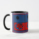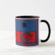 Caneca de café amigável da flor com as flores geométricas contemporâneas vívidas. Vermelho vívido, azul, preto. Ocasião especial perfeita ou presente do Natal. Design original brilhante por Anne Bell.