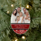 O Feliz Natal ornament customizável com sua própria foto de família no vermelho elegante, cor damasco floral clássica preto e branco. Um presente à moda do Natal para a família e os amigos ou para decorar sua árvore ou casa de Natal para os feriados.