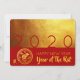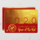 Design moderno com imagem de textura de ouro com grande 2020 em vermelho + pequeno ideograma de papel Rat + Rat com textos amarelos FELIZ ANO NOVO e Ano do Rato sobre fundo vermelho. Design na placa de convite horizontal simples com fundo vermelho no verso e texto para que o Partido Chinês de Ano Novo personalize. Você pode facilmente alterar o texto (fonte, cor, tamanho e posição) clicando no botão personalizar. Cartão de saudação, cartão postal e muito mais... Perfeito para um eterno e moderno Ano Novo Chinês do Rato 2020.