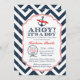 Ahoy! É um menino. Convite náutico bonito do chá de fraldas do menino com grande teste padrão da viga, e elementos da navigação. Âncora e corda náutica. O vermelho azul e corajoso, faz uma indicação com este design!!