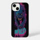 A bold, vertical and highly energetic graphic illustration featuring a snarling black panther or jaguar. The creature is rendered in a vivid, neon color palette dominated by deep blues, cyan, magenta, and purple, with fierce, glowing yellow eyes. The panther appears to be charging directly toward the viewer, with its claws extended and teeth bared. Below the animal, the word "WILD" is written in large, bold, stylized turquoise letters. The entire image has a gritty, street art or graffiti style, utilizing dynamic paint splatters and grunge textures that emphasize the animal's raw power and untamed nature.
