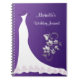 Vestido de casamento branco e floral de prata com borboleta em um caderno roxo do planejador do casamento do fundo. Você pode ajustar o texto de acordo com suas exigências.