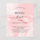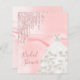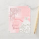 Chá de panela elegante, clássico, glamouroso e feminino. Um vestido branco com brilho sujo, pintura pingando. Pincel rosa, impressão de seda como fundo. Com o texto: Chá de panela na frente escrito com um moderno script de estilo escrito à mão. Adicione os detalhes do evento no verso.