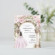 Um grande arco de mármore decorado com flores cor-de-rosa. Uma garota com um vestido de rosa claro. Personalize e adicione um nome e detalhes. 1 folha = 1 convite impresso de borda a borda.
