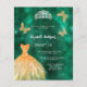 Um convite moderno, na moda e glamouroso para uma doce festa de aniversário 16, 16. Um fundo verde esmeralda estudado com ouro falso um vestido, uma tiara prateada falsa e borboletas ouros. O nome é escrito com um moderno estilo escrito à mão. Personalize e adicione os detalhes da sua festa. 1 folha = 1 convite impresso de borda a borda.