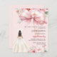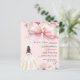 Um fundo rosa pincelado elegante, decorado com um grande arco rosa, flores cor-de-rosa e uma garota de vestido creme. Personalize e adicione um nome e detalhes da parte. 1 folha = 1 convite impresso de borda a borda.