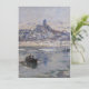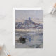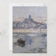 Imagem de inverno de pescador no rio com vila e torre ao fundo. Pintura única a ser enviada como cartões de natal. Belas artes pelo artista francês Claude Monet.