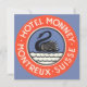 Ilustração vintage de pôster de viagem europeu ou etiqueta de bagagem do Hotel Monney, Montreux, Suíça, apresentando um design circular com um cisne nadando em um lago. Hotel Monney, Montreaux, Suíça.
